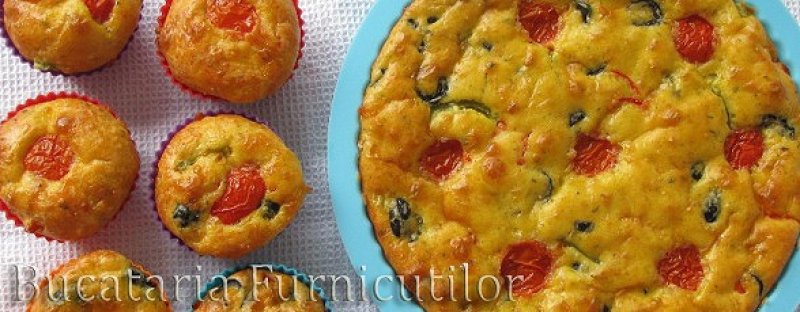 Turnam aluatul in tava unsa cu ulei si ornam cu jumatatile de rosii. Dam la cuptor pentru vreo 40 - 45 de minute, pana se rumeneste frumos. Atat muffin-urile cat si tarta au crescut foarte frumos, au fost foarte pufoase si aromate.