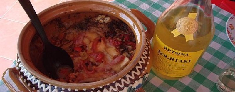 Se taie rosiile cubulete se pun pe fundul unei oale de lut si se dau la cuptor 5-7 minute. Dupa aceasta se adauga peste ardeii taiati fasii, ceapa taiata solzisori, ceapa verde maruntita, mararul si patrunjelul, oregano si busiocul. Feta taiata cubulete si 3/4 din Kefalograviera ras. Se rastoarna si uleiul si se condimenteaza dupa gust dupa care se amesteca putin si se da la cuptor, preincalzit si tinut la submediu, oala acoperita. Dupa circa 20 de minute se ia capacul, se rastoarna uniform si restul de Kefalograviera ras si se da asa descoperita la loc la cuptor dar mai micsorat la caldura pentru maxim 10 minute sa se faca frumos o coaja de cascaval topit. Atentie sa nu scada prea mult si sa se arda. Mai puteti reduce timpii in functie de aragazul dvs. serviti cald preparatul (dar mege foarte bine si rece) cu un pahar de Retzina (asa cum am preferat eu deoarece aveam o sticla la rece) alaturi sau unul de Ouzo dupa cum va place.