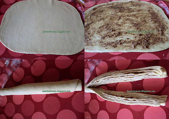 Framantam aluatul dospit pentru a scoate bulele de aer din el apoi intindem o foaie dreptunghiulara cu cca 1 cm grosime. Ungem foaia cu amestecul de unt , lasand putin pentru final de uns si rulam , cu un cutit bine ascutit taiem pe lung in doua, lasand foarte putin la capat netaiat.