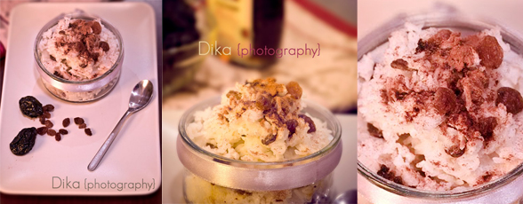 Se incepe cu fierberea orezului in lapte. La o cana de orez se pun trei cani de lapte. Se poate folosi orez cu bob rotund sau cu bob lung, ca si cel din fotografii. Se adauga in timpul fierberii cateva linguri de zahar si un praf de sare. La sfarsit, inainte de a-l lua de pe foc, se pune o mana de stafide, puneti pe masa tot felul de fructe uscate sau dulceata de fructe pentru a se servi impreuna cu orezul, deasupra am pus sirop de artar si scortisoara.