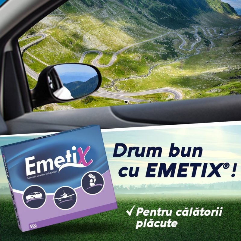 Ca sa-ti pastrezi stomacul usor in timpul calatoriei si sa scapi si de raul de miscare, alege EMETIX®, o formula naturala si sigura ce combina extractul de ghimbir si vitamina B6, fiind special dezvoltata pentru a combate starile de greata si voma.