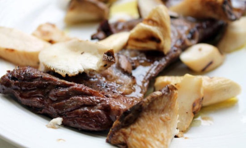 Friptura obtinuta astfel se ia de pe foc si se unge pe ambele parti cu amestecul din unt si vin. Se taie in felii si se serveste cu ciuperci.
