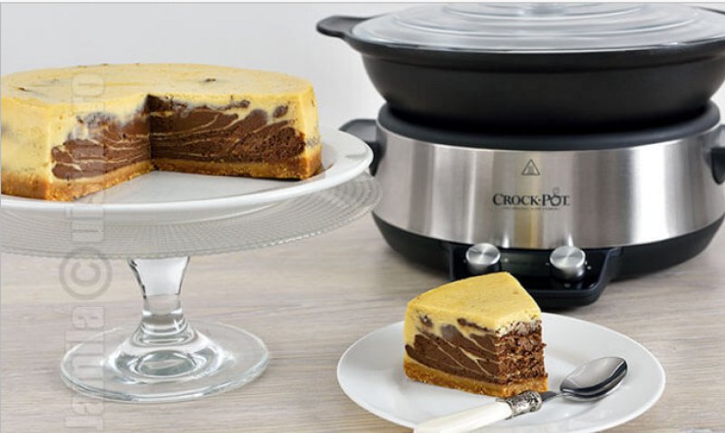 La Crock-Pot nu este nevoie sa ridicam capacul aparatului, pur si simplu punem o hartie de copt deasupra vasului inainte de a pune capacul, asta pentru a nu permite picaturilor de apa formate sa curga in prajitura, si lasam cheesecake-ul sa se coaca. In 4 ore va fi perfect. Obtinem un cheesecake cu ciocolata la Crock-Pot, fin, cremos, delicios, fara sa fie copt prea mult si nu in ultimul rand fara efort.