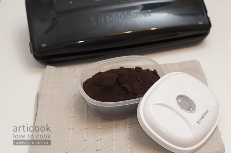 Pana acum am fost nevoita de cateva ori sa arunc pachet intreg de cafea tocmai din cauza ca toata aroma a disparut si nu mai avea nici un gust. Am vidat cafea macinata proaspat deschisa in caserola FoodSaver, pentru ca asa sta proaspata tot timpul consumului nu doar in ziua in care am desfacut-o.