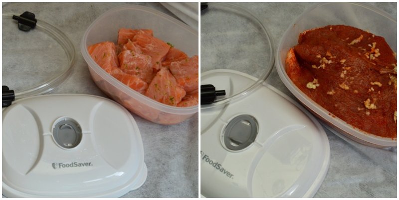Pentru ca vreau sa fac mai tarziu niste frigarui de somon si o friptura de porc dar nu as vrea nici sa miroasa a peste si a usturoi in frigider si totdata n-as vrea ca pestele sa se altereze am ales solutia ceamai eficienta. Somonul l-am taiat cubulete, l-am asezat in caserola, am stors peste el putina zeama de limeta si amras si utina coaja apoi am pus capacul si am vidat caserola.